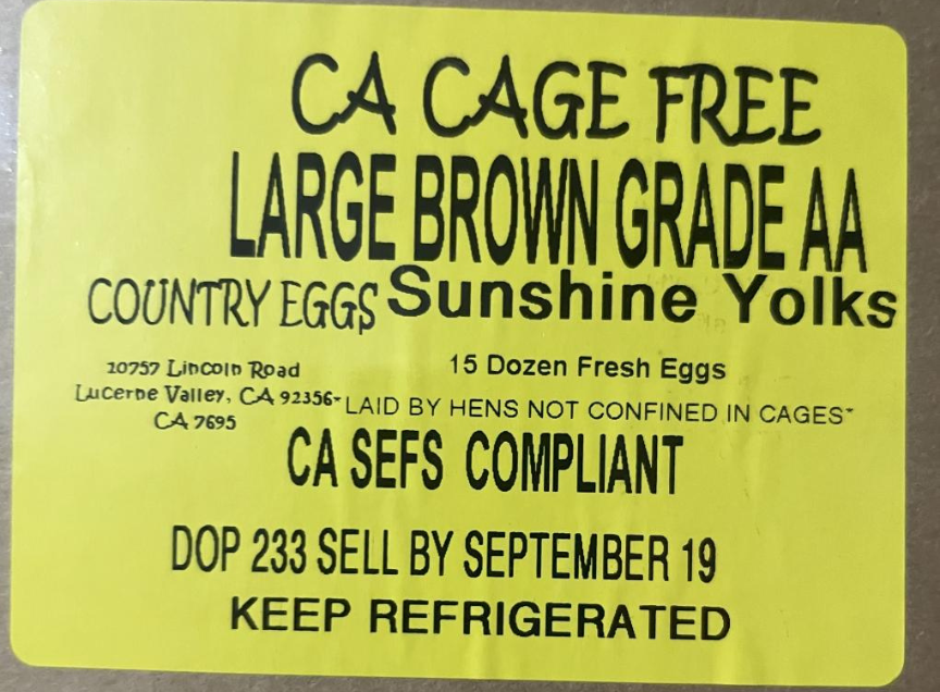 LUCERNE VALLEY, Ca — Country Eggs, LLC recently announced the recall of their large brown cage free sunshine yolks for potential Salmonella contamination.