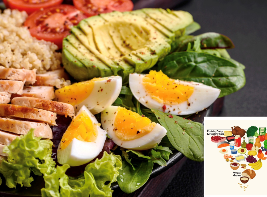 Among the recommendations given include: a priority for protein; full-fat dairy with no added sugar; whole forms of vegetables and fruits; healthy fats from whole foods like meat, eggs, seafood, nut and seeds, avocados and olives; a whole grain focus but with a reduction in carbohydrates; a limit of highly processed foods with artificial additives and sugars; right amount of food for an individual based on age and activity level; for hydration consuming water and unsweetened beverages; and a limit of alcoholic beverage consumption.