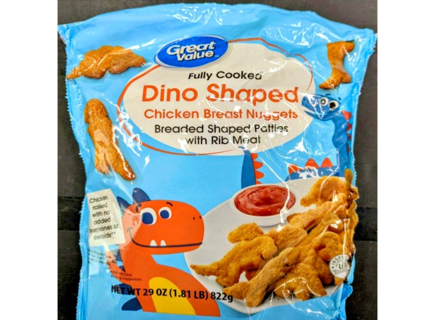 - 29-oz. plastic bags containing approx. 36 “GREAT VALUE FULLY COOKED DINO SHAPED CHICKEN BREAST NUGGETS” with “BEST IF USED BY” date “FEB 10, 2027,” lot code “0416DPO1215,” and establishment number “P44164” printed on the back of the bag.