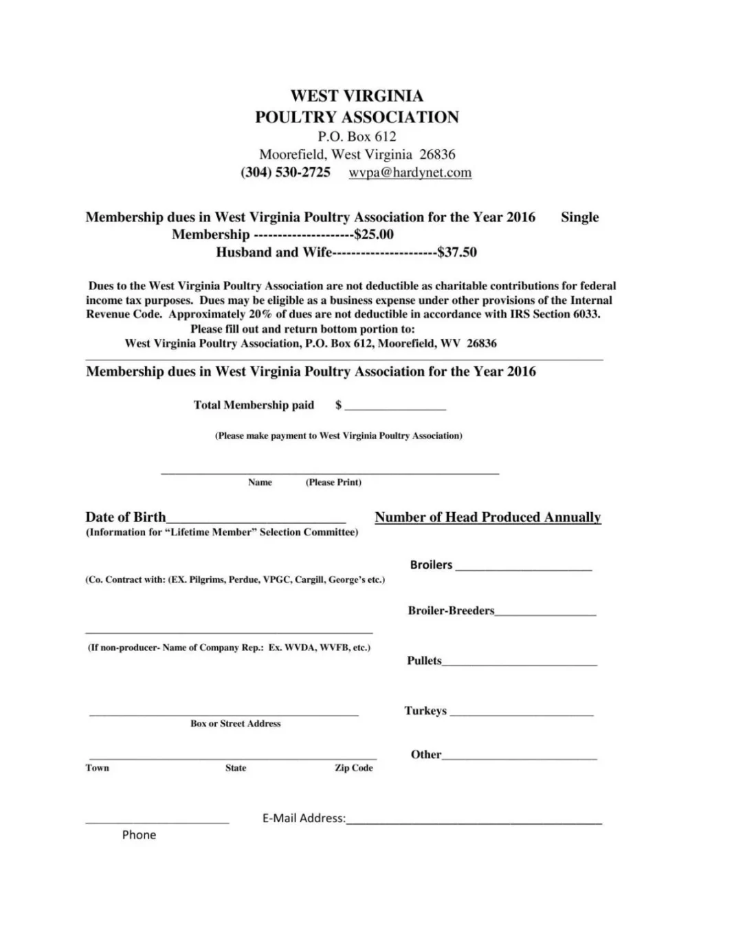 The WVPA is accepting new memberships and renewals for the 2016 year. The annual membership is $25 per person or $37.50 for a husband and wife membership.
